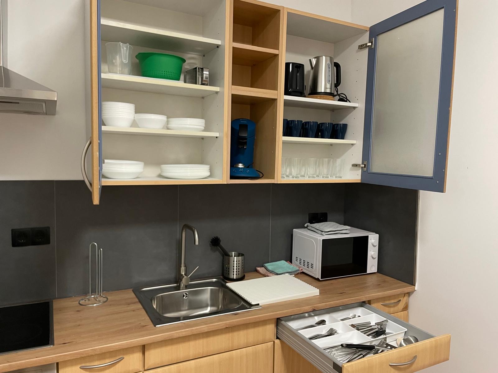 Jede Wohnung verfügt über eine eigene Küche, ein eigenes Bad und abschließbare Schlafzimmer – perfekt für Teams.